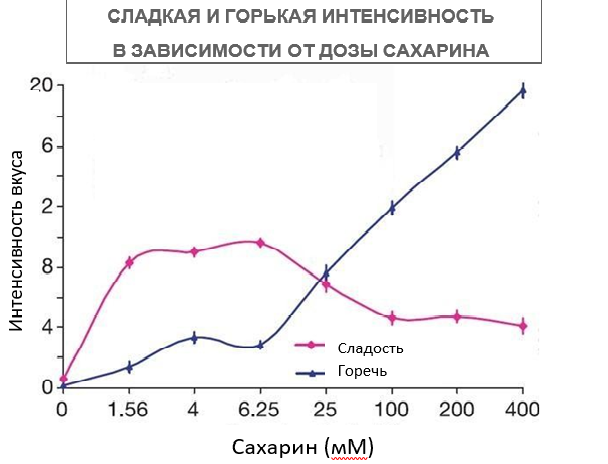 С 1951 года хорошо известно из литературы, что интенсивный подсластитель сахарин имеет горький вкус, и что это не связано с производственными примесями, а связано с одной единственной молекулой. Интенсивность горького и сладкого вкуса зависит от дозы сахарина (см. рисунок).