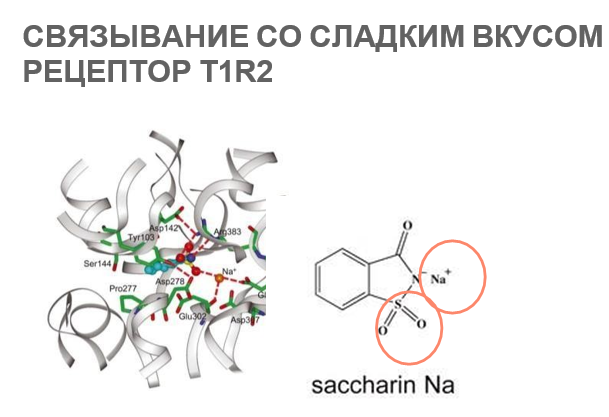 На рисунке приведено схематическое изображение сахарина в пределах T1R2-ATD, а оранжевым цветом выделены места связывания сахарина4.