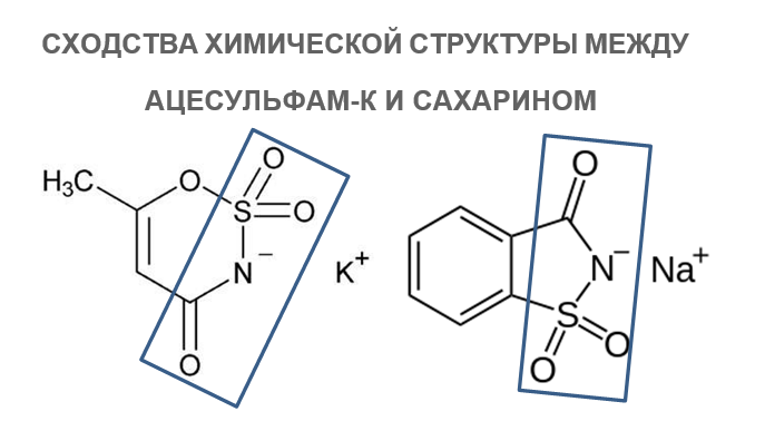Связь сахарина с рецепторами горького вкуса также ограничена, но некоторые авторы5 предполагают, что существует огромное сходство между химическими структурами ацесульфама-К и сахарина, что может быть одной из причин их горького вкуса (см. рисунок). Можно также заметить, что данное сходство химических функций частично соответствует связыванию сахарина в T2R рецептора. Как следствие, продукт, который «содержит» некоторые молекулы, способные инактивировать функциональную группу, придающую сахарину его горький вкус, также уничтожит и функциональную группу, создающую связи с рецептором сладкого вкуса и отменит его конечную сладкую интенсивность.